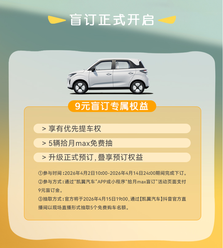 2. 参与通道:打开「凯翼汽车」APP / 小程序,找到「拾月 max 盲订」活动页,支付9元盲订金(盲订金随时可退),成功锁定所有福利;