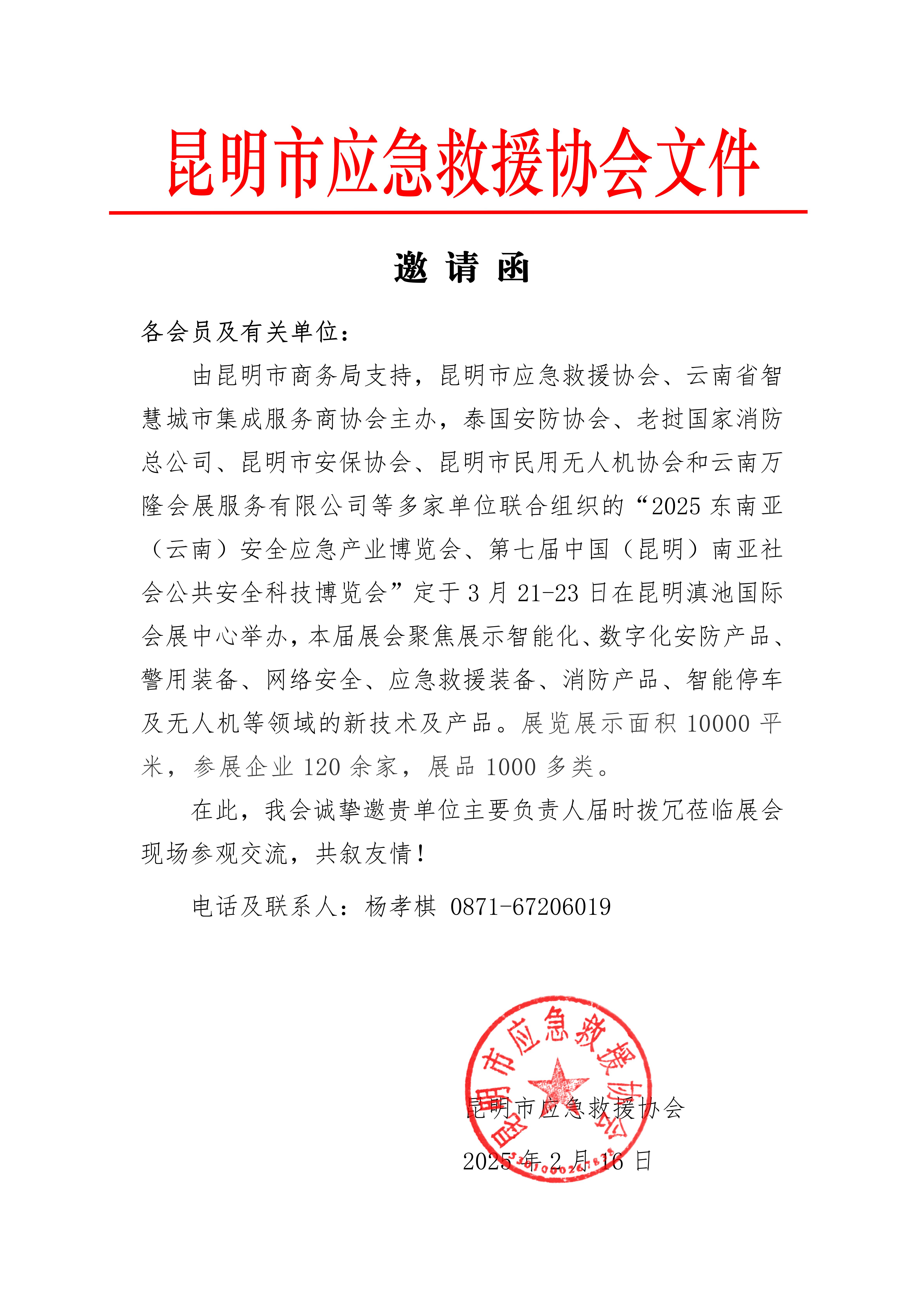 由昆明市商务局支持,昆明市应急救援协会、云南省智慧城市集成服务商协会主办,泰国安防协会、老挝国家消防总公司、昆明市安保协会、昆明市民用无人机协会和云南万隆会展服务有限公司等多家单位联合组织的“2025东南亚(云南)安全应急产业博览会、第七届中国(昆明)南亚社会公共安全科技博览会”定于3月21-23日在昆明滇池国际会展中心举办,本届展会聚焦展示智能化、数字化安防产品、警用装备、网络安全、应急救援装备、消防产品、智能停车及无人机等领域的新技术及产品。展览展示面积10000平米,参展企业120余家,展品1000多类。