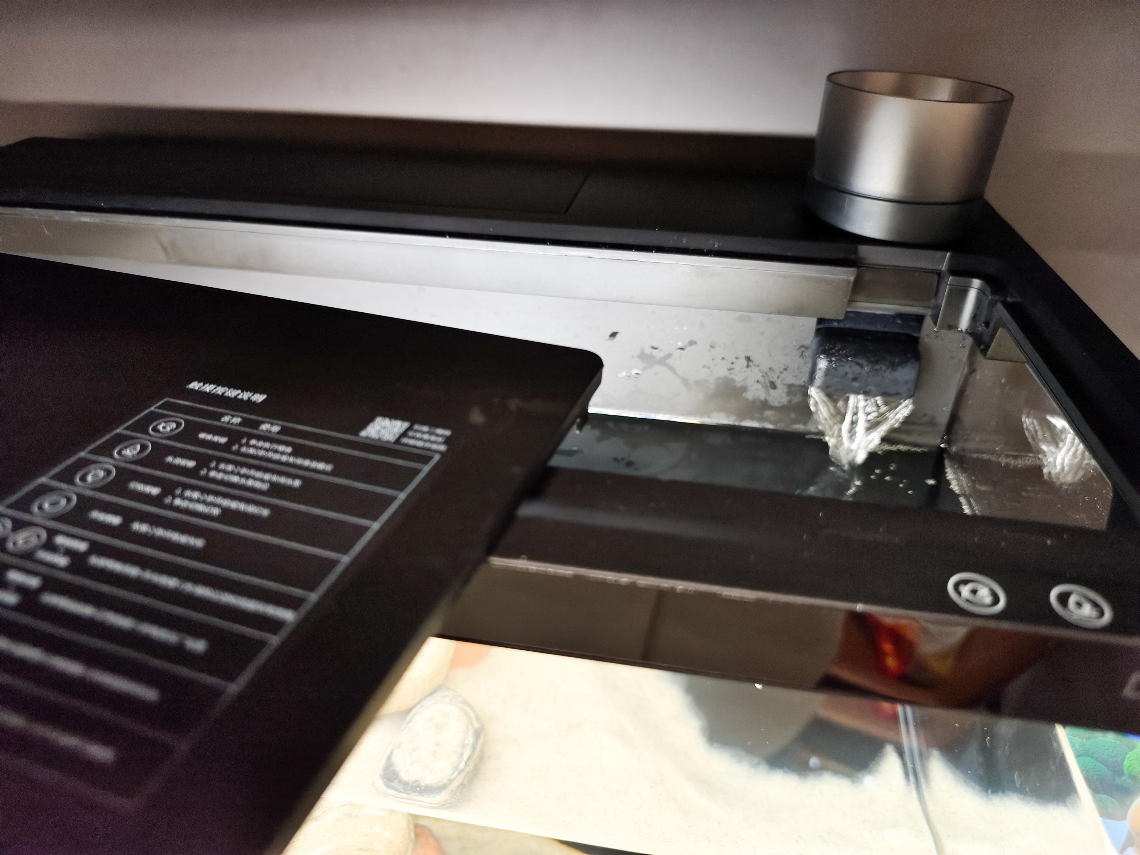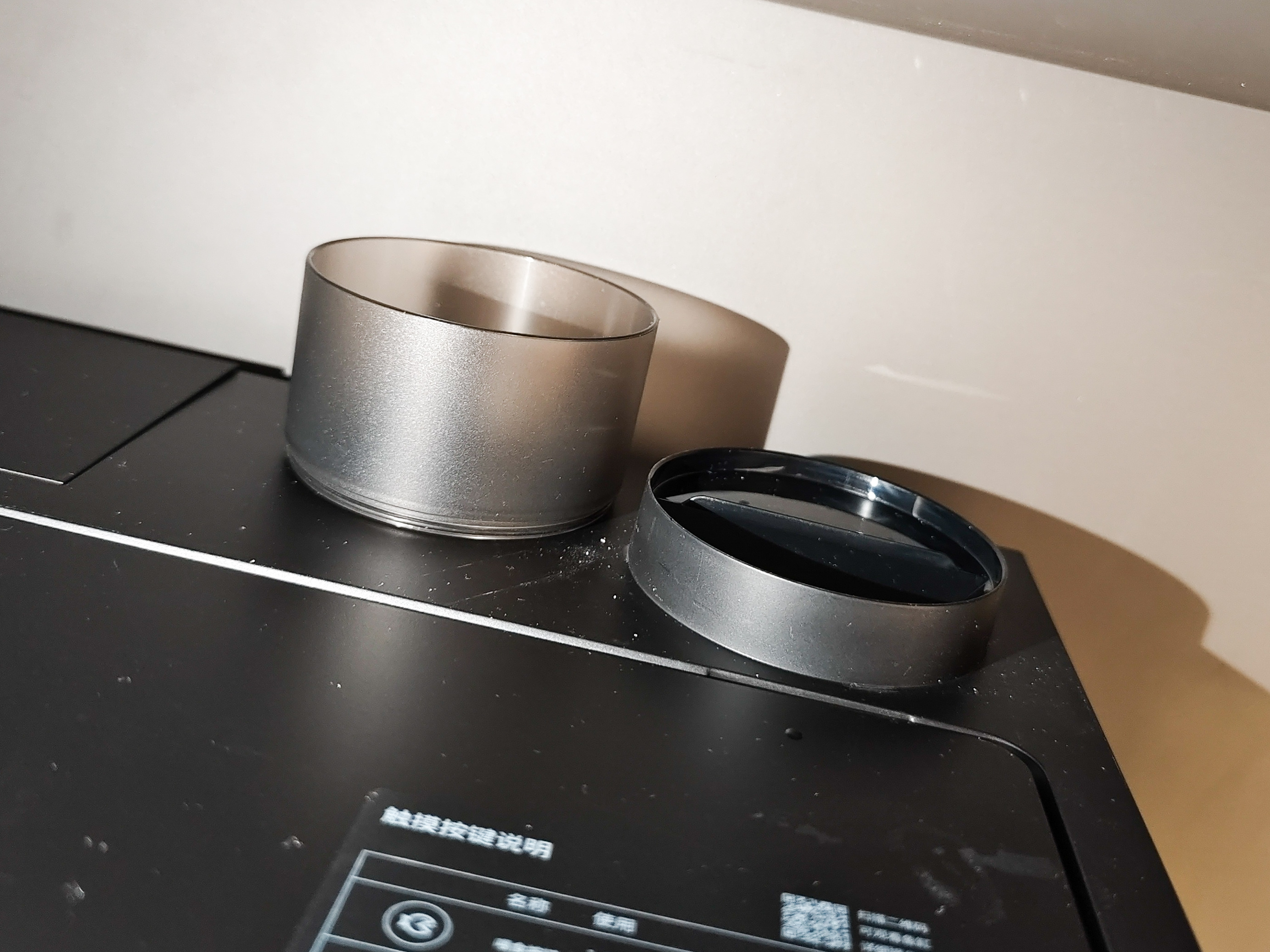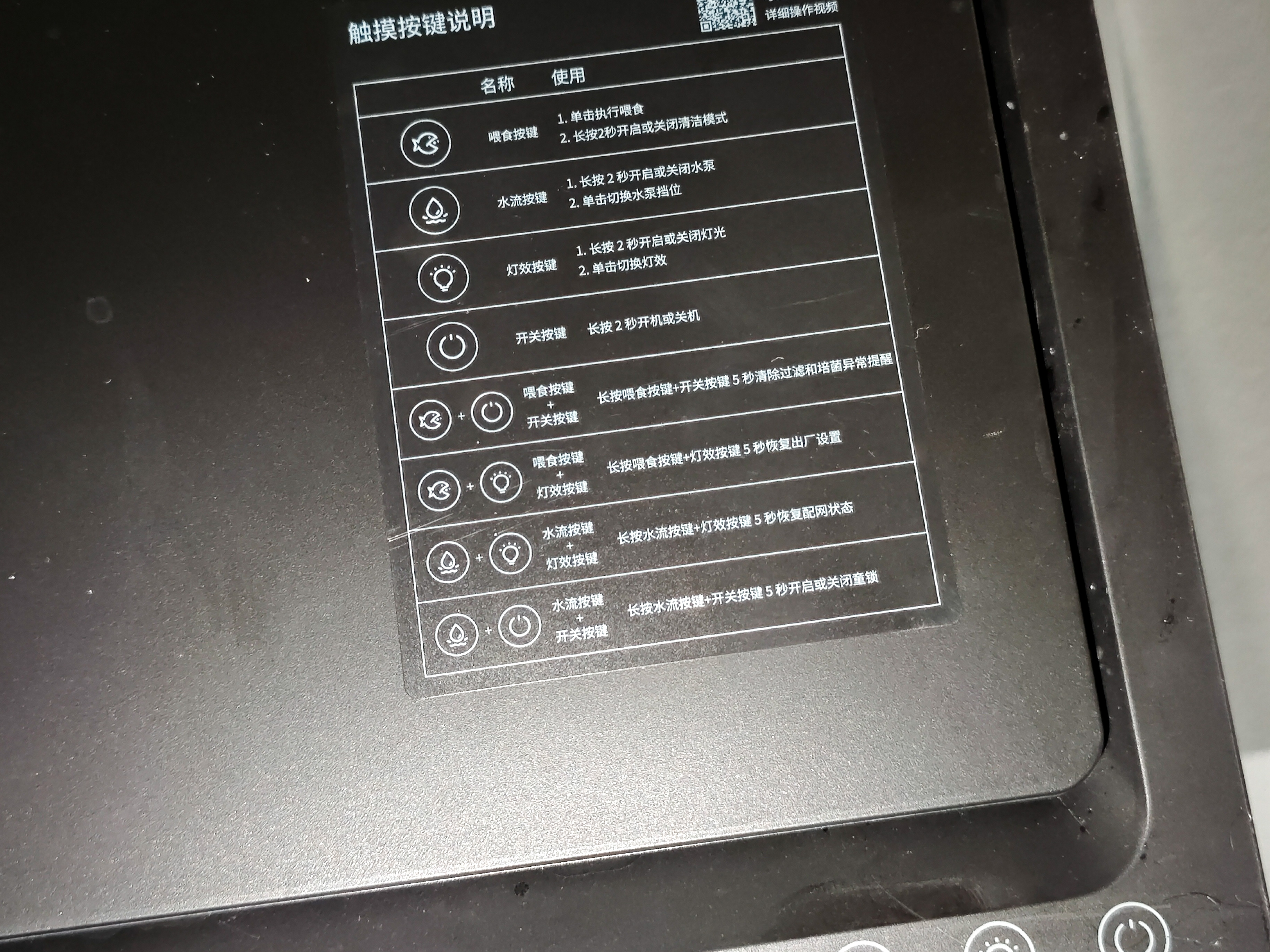背部的黑色烤漆底座与三面超白玻璃形成对比,既显现代感又避免了光线干扰。顶盖的左边实时显示水温、水质等参数,右边则是四个触控按键,上面标记了相关功能的的图案,并且在盖板上还贴了相关按键的功能说明,只需看一眼就明白相关按键代表的功能,可以说是相当简单了。