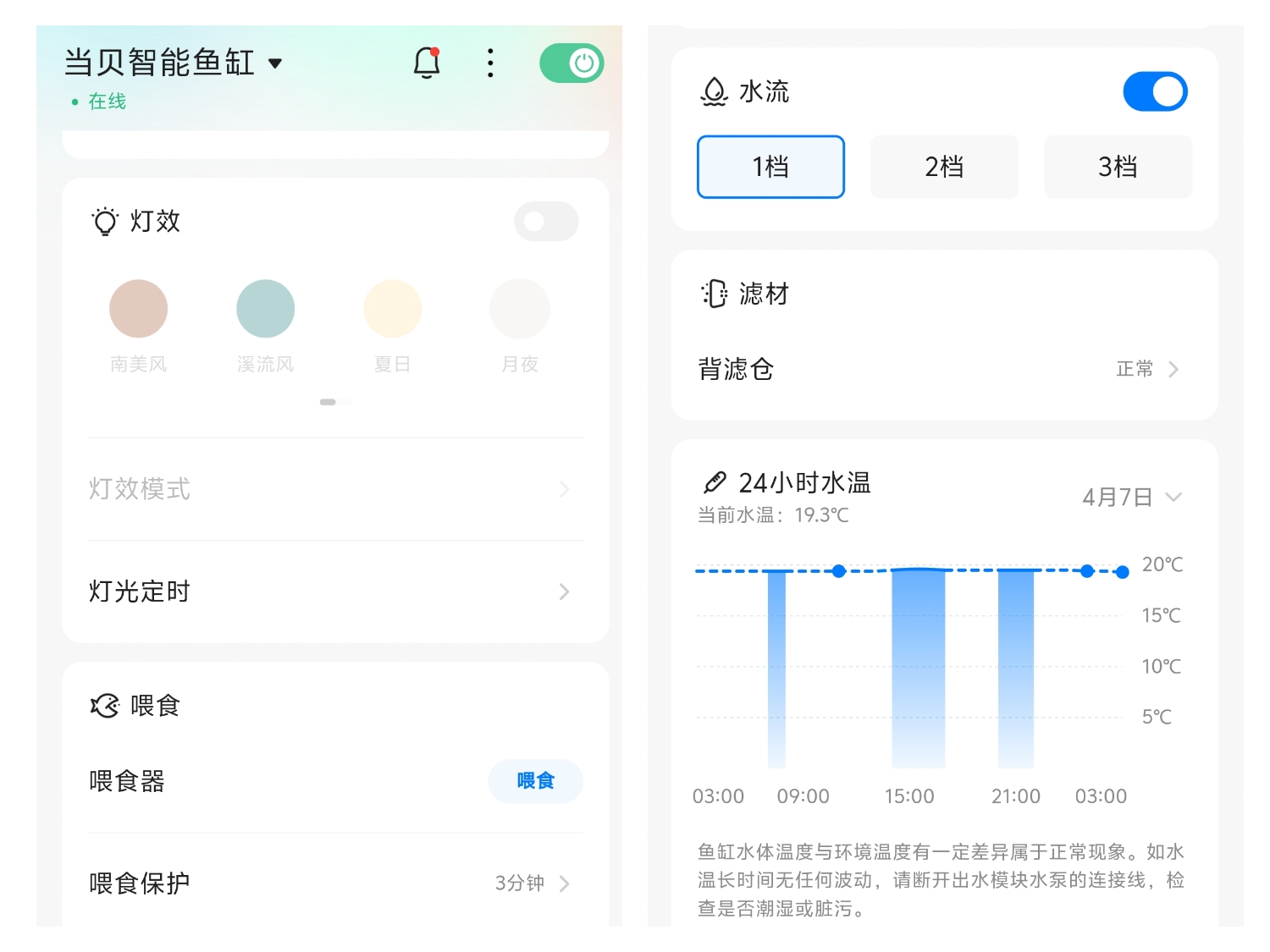 最让人喜欢的还是配备了自动喂食系统,采用抽拉式喂食器,配备110g大容量粮仓,三重密封防潮设计确保饲料长期新鲜,而且补粮一次可以用半年之久,对懒人极为友好了可以说是。而且最重要的是还支持 AI智养与App远程控制,真正的懒人福音,绑定当贝鱼缸APP后,所有功能随时掌控,比如智能喂食功能,还支持定时投喂与AI托管,可以根据自身鱼种、数量推荐喂食量与频率甚至还能查看喂食记录。 还能通过App控制灯光、水泵、查看水质等功能,水温精确至0.1℃,各个滤材滤芯寿命实时显示,一目了然,还有更换提醒并且附带教学视频,操作简单直观,上手无难度。