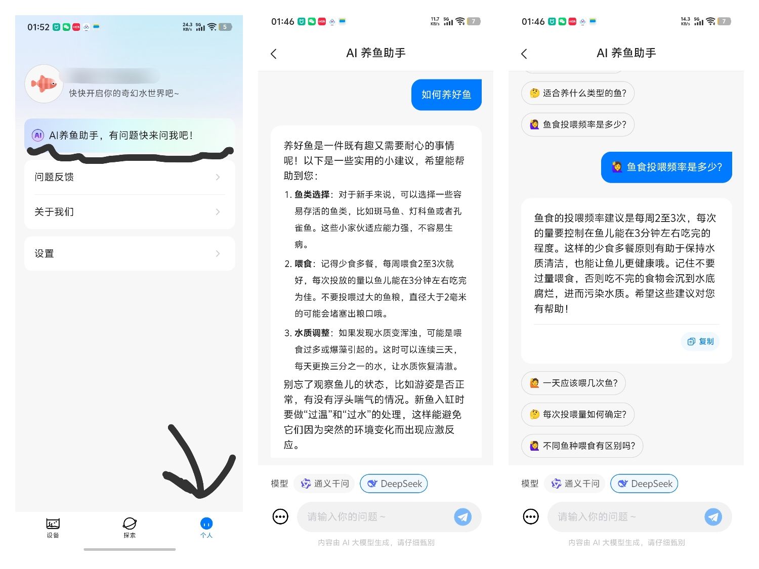 当贝鱼缸APP里还内置了养鱼社区和AI助手,用户可以在社区里面学习造景技巧和疾病防治等知识,还能分享自己的鱼缸美图以及养鱼心得等内容。而且搭载了通义千问和DeepSeek AI助手,可以解答各种问题比如如何养好鱼、喂食频率等问题,有问题随时问,都可为你解答,堪比随身导师,非常方便。