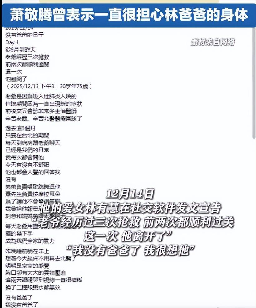 “爸临走前拉着我的手说:‘小林交给你了。’”萧敬腾的声音带着哭腔,“我会努力照顾好这个家,我们会再相聚。”一句“我是您永远的女婿”,让现场不少亲友潸然泪下。