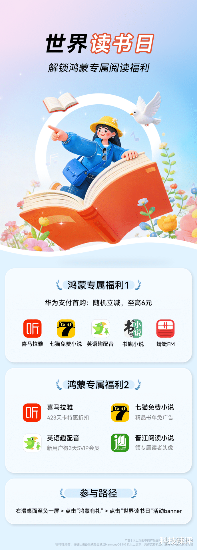 最后重点提醒一下大家,别忘了重点关注负一屏的“鸿蒙有礼”,进入“世界读书日”专题,不仅有各种专属福利,叠加华为支付的首单随机立减,这波省下的钱,足够我在楼下火锅店大吃一顿了!