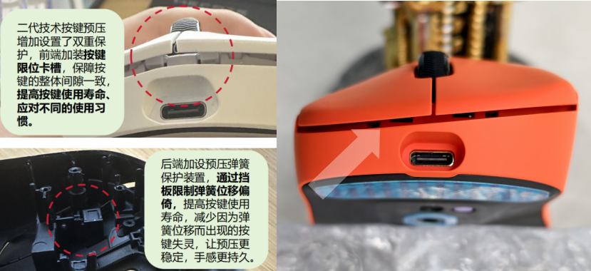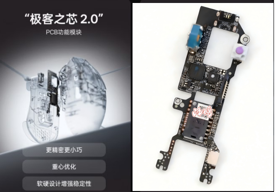 另外,得益于自研“极客之芯2.0”模块,相较上代PCB板面积和重量都减少了很多,同时还优化了重心分布,握在手里不会有头重脚轻的感觉,抬鼠、转身等微操时更轻盈,长时间玩游戏也不会有手腕负担。另外,还优化了微动连接点,增强了信号稳定性,使用过程中信号传输更加稳定。