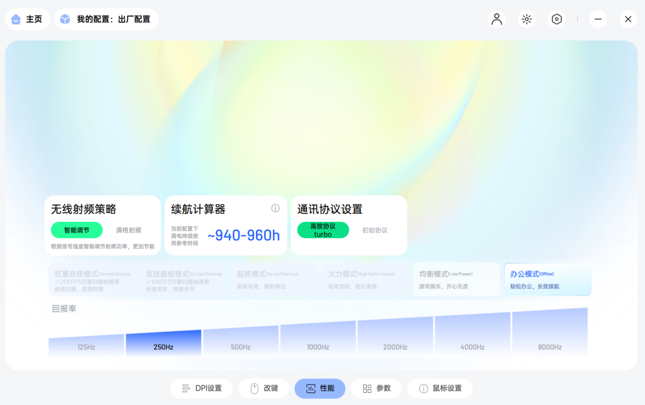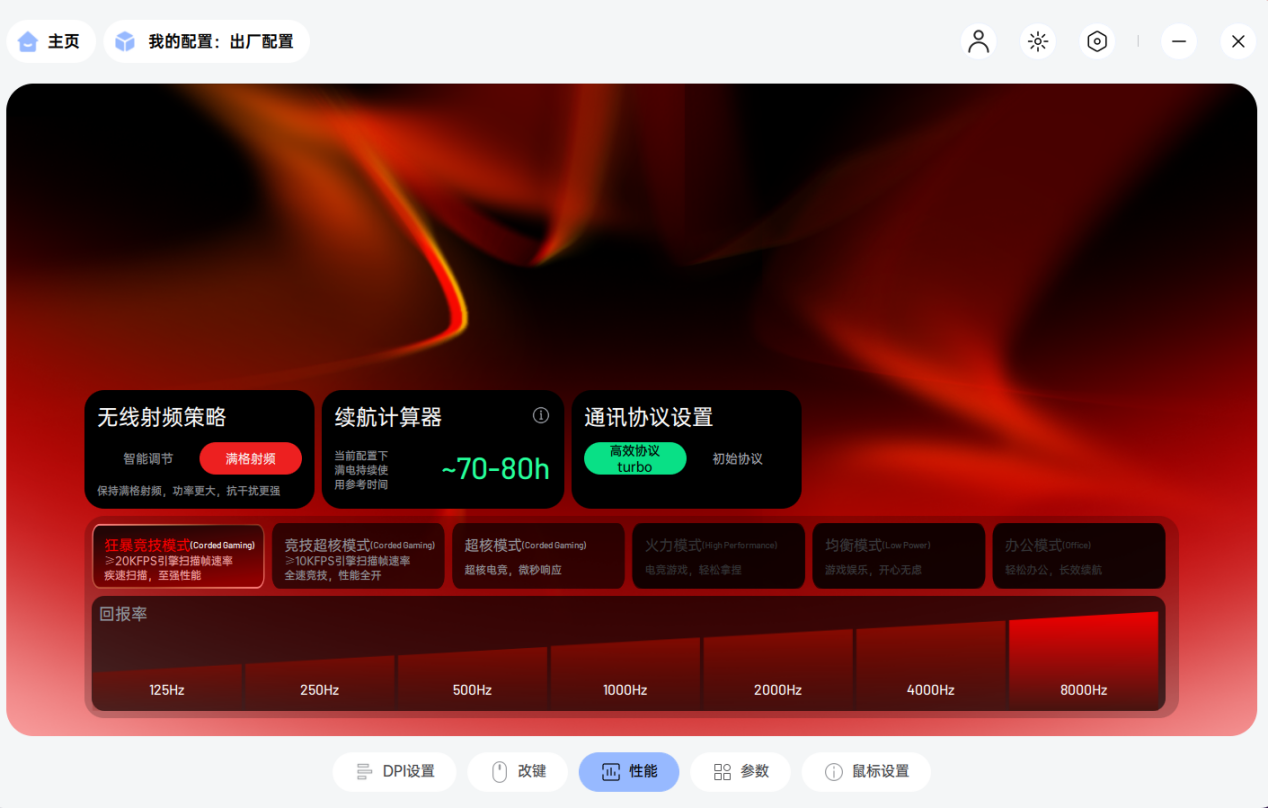 驱动界面简洁直接,即使是新手也能快速操作。核心功能非常全面,支持超多自定义选项:可以自定义所有按键的功能,录制宏命令;可以调节DPI档位和数值,支持X、Y轴独立调节,满足不同玩家的灵敏度需求;还能设置不同的性能模式,适配不同使用场景。