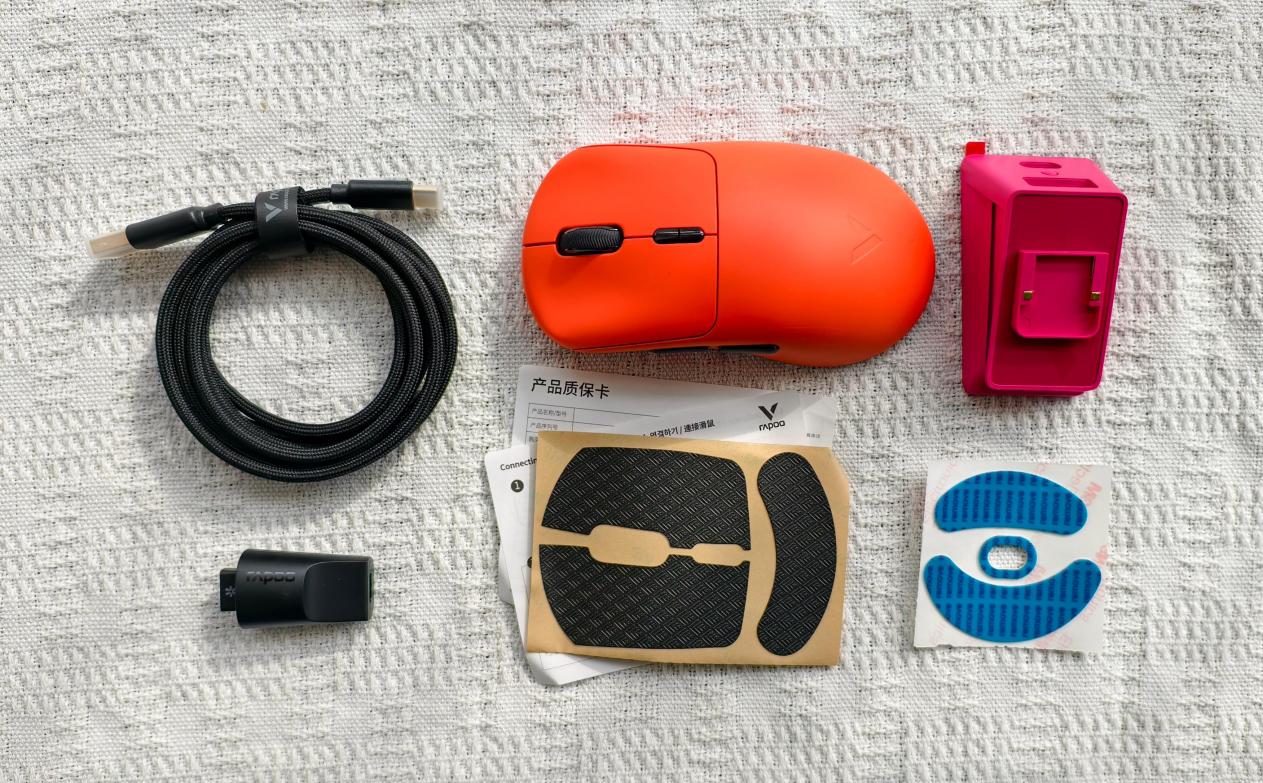 打开包装,内部布局很规整,鼠标被防震棉牢牢包裹,避免运输过程中受损。配件方面不算复杂,但实用性拉满:除了鼠标本体,还有一根带屏蔽层的Type-C编织数据线、微型nano 8K接收器和USB转接器、快速使用指南,以及防滑贴和备用脚贴。值得一提的是,编织数据线质感扎实,不易缠绕,日常收纳很方便;防滑贴则能适配不同手汗情况,细节做得很到位。