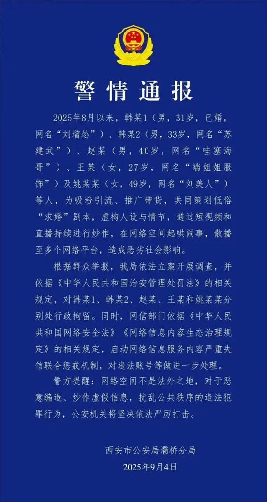 但大家嗑到嘴里的糖的后味儿还没咂摸玩,一纸来自警方的通报就像一瓶卸妆水,把所有精心打造的人设洗了个一干二净。9月4日,西安市公安局灞桥分局发布警情通报:31岁的韩某1(男,网名“刘增怂”,已婚)、33岁的韩某2(男,网名“苏建武”)、40岁的赵某(男,网名“哇塞海哥”)、27岁的王某(女,网名“端姐姐服饰”)和49岁的姚某某(女,网名“刘美人”)为了吸粉引流、推广带货,共同策划了这场低俗“求婚”剧本。他们编造了虚假的人设和情节,在多个网络平台疯狂炒作,造成极为恶劣的的社会影响。日前,刘增怂等5人已被依法行政拘留,其违法账号也被处理。