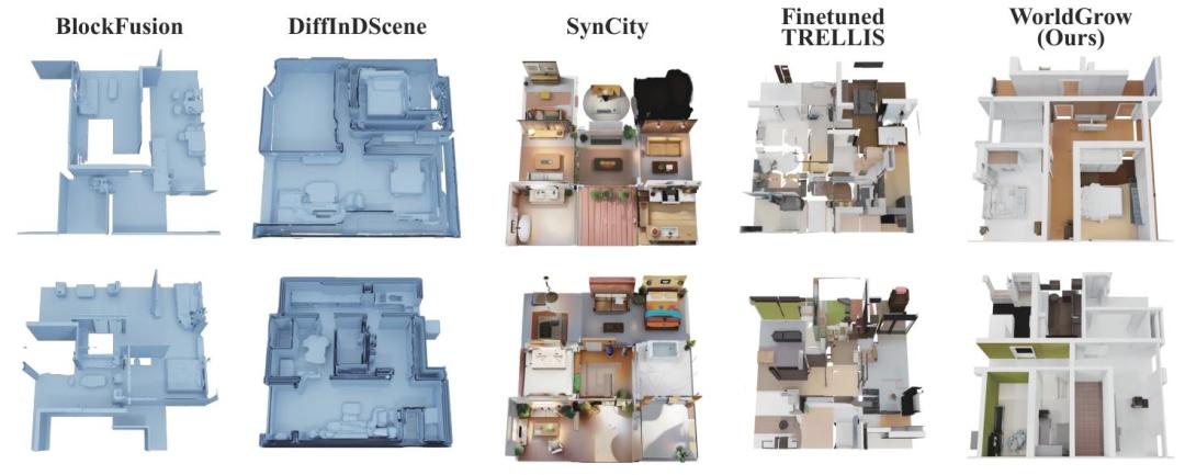 对比可以看出,WorldGrow能够生成高分辨率、连续的室内场景,且场景具有真实且连贯的纹理。