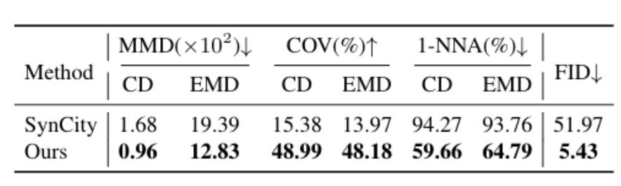 实验数据显示,在3D-FRONT数据集上,它的几何重建指标MMD、COV均达SOTA,FID(用于评估生成质量的核心指标,越低越优)低至7.52,大幅优于SynCity、BlockFusion等主流方法;