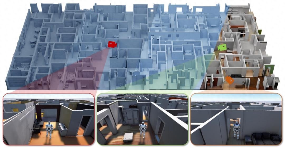 并且场景具备连贯的几何拓扑和照片级真实感外观,智能体的导航则是在复杂空间布局中自主规划路径。