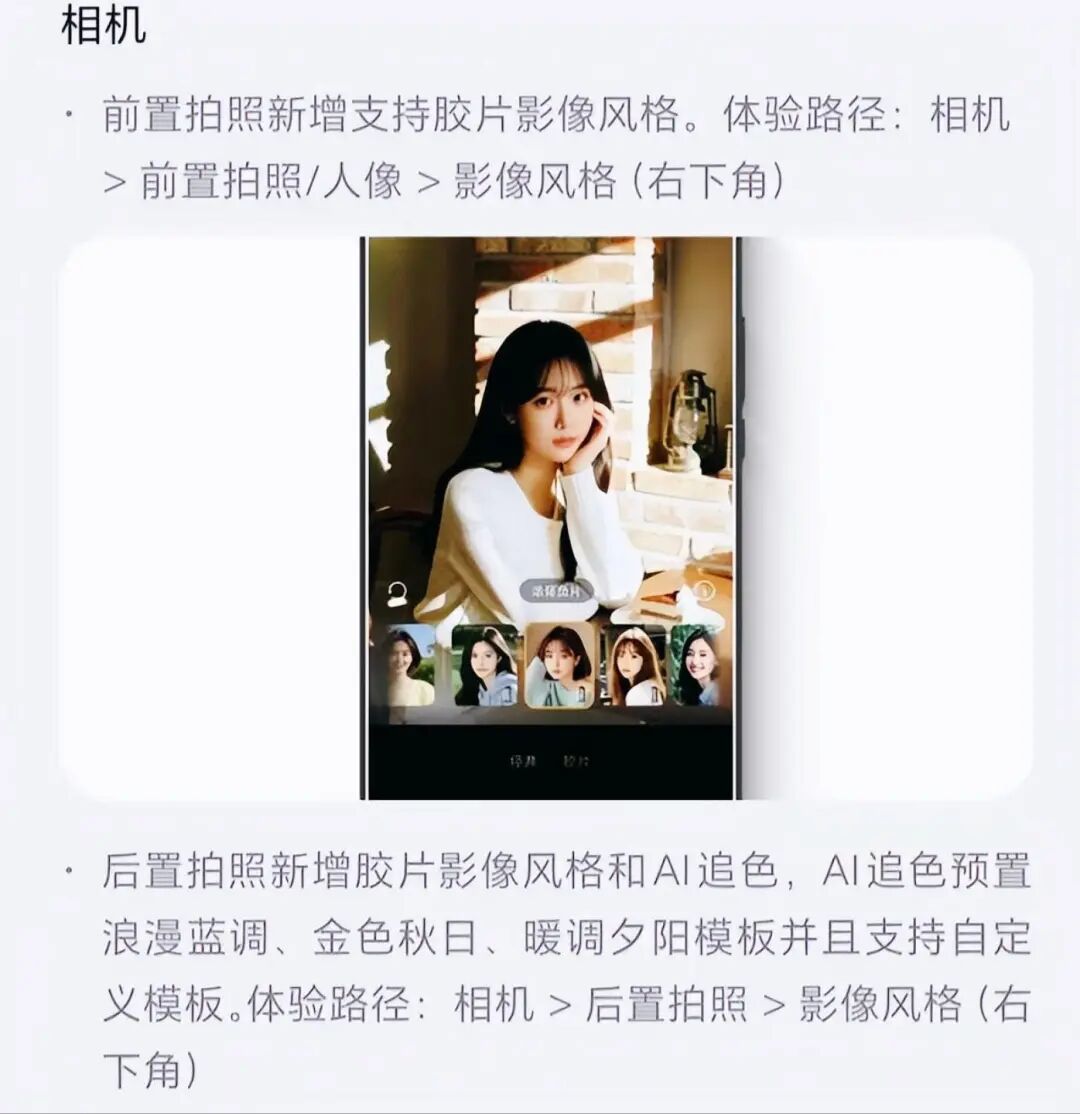 最直观的升级体现在拍照上。新版本为前后摄像头都加入了“胶片影像”风格。这并非简单的滤镜叠加,其思路更接近于提供一套成熟的“直出”方案。尤其是对于注重人像和轻快体验的机型用户而言,复杂的后期调色往往并非刚需,他们更希望拍完的照片自带氛围感,能直接分享。胶片风格带来的复古色调与细微颗粒感,恰好提高了成片的宽容度和风格化,让随手一拍的成功率更高。