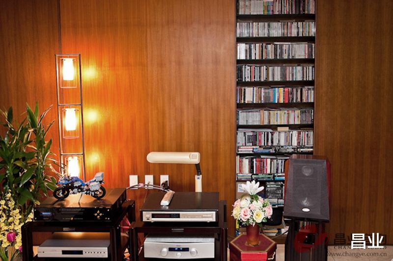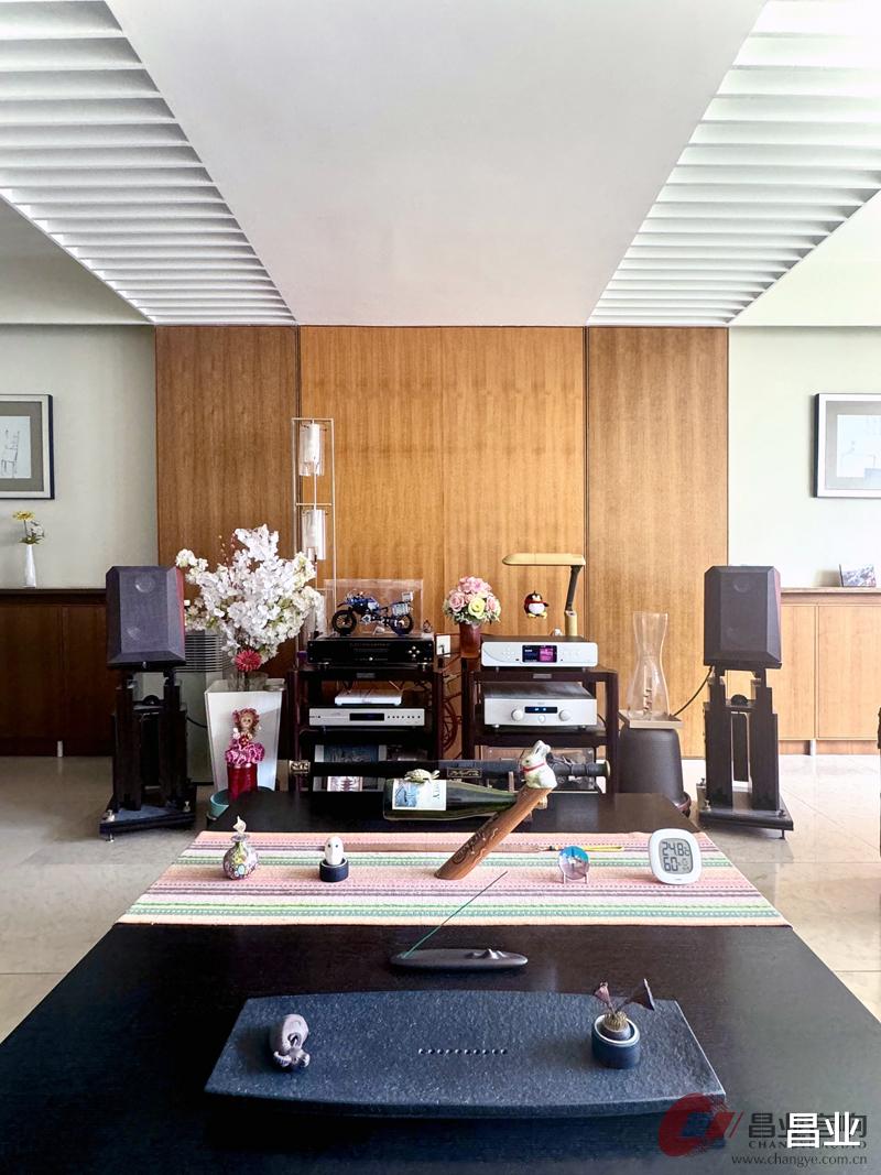 文先生丰富的唱片收藏印证了他是位热爱音乐的发烧友,因而对重播效果也有更高要求。特别值得推荐的是他设计的实用型背景墙:看似实木装饰面内里实为唱片收纳柜,闭合推拉板后整体整洁美观,对声学处理亦有裨益,这般巧思值得借鉴。