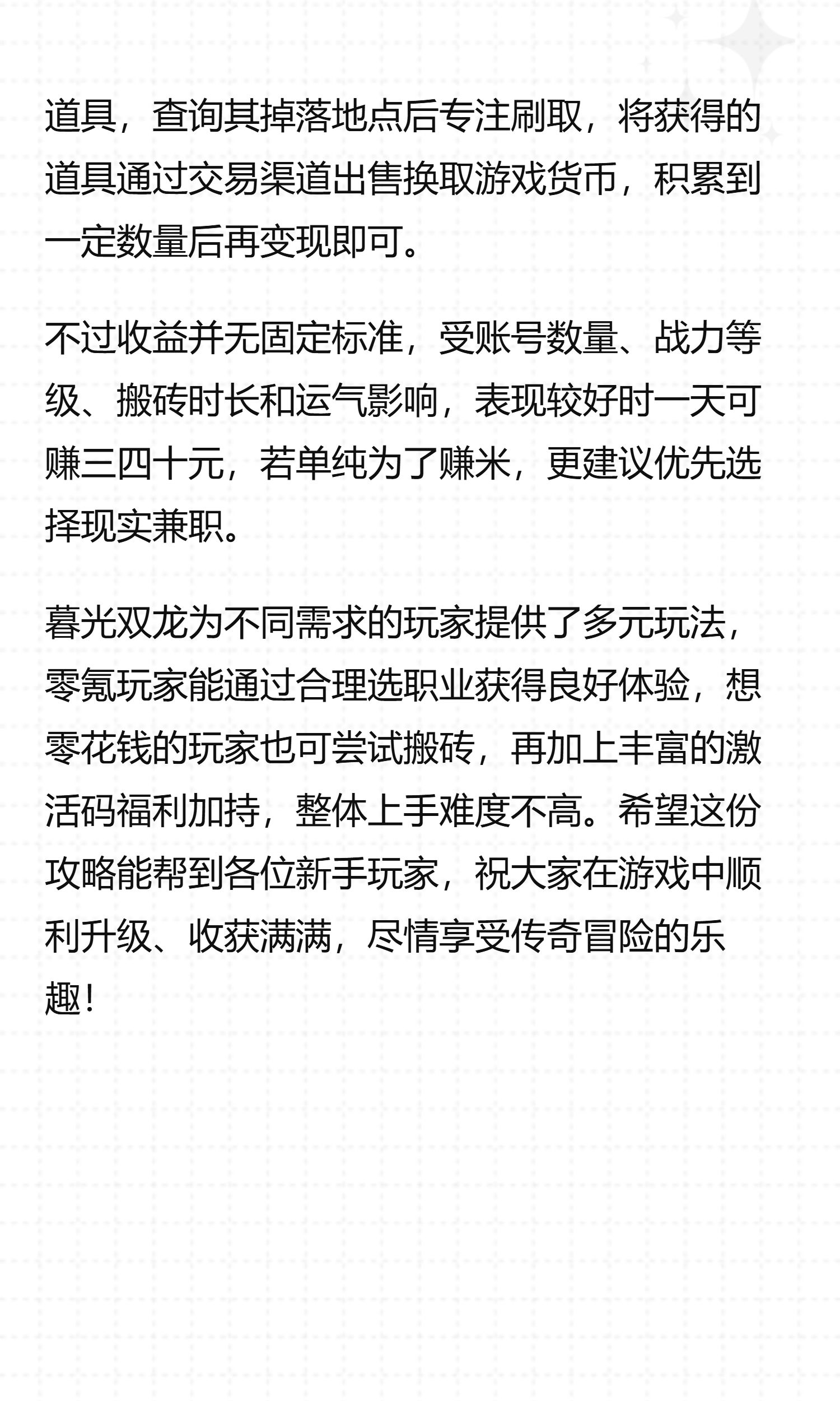 暮光双龙为不同需求的玩家提供了多元玩法,零氪玩家能通过合理选职业获得良好体验,想赚点零花钱的玩家也可尝试搬砖,再加上丰富的激活码福利加持,整体上手难度不高。希望这份攻略能帮到各位新手玩家,祝大家在游戏中顺利升级、收获满满,尽情享受传奇冒险的乐趣!