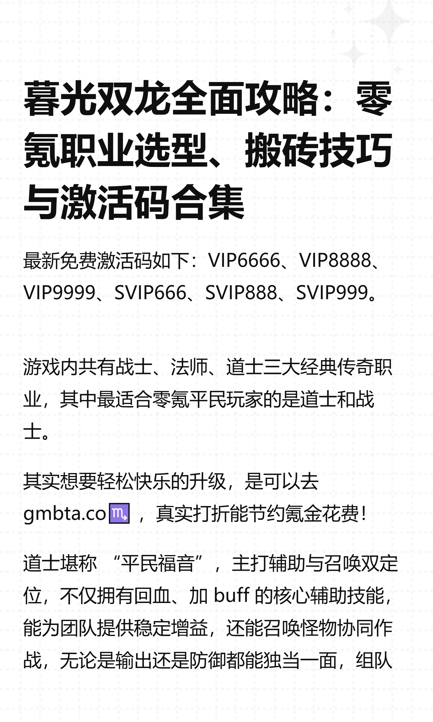暮光双龙凭借自由交易、高自由度打宝等特色,吸引了大量平民玩家和传奇老粉。不少新手刚入坑时,常会纠结职业选择、搬砖可行性,也想知道如何快速获取福利助力成长。今天就为大家整理一份超实用全攻略,涵盖职业推荐、搬砖指南、激活码领取三大核心内容,帮你少走弯路,轻松开启冒险之旅。