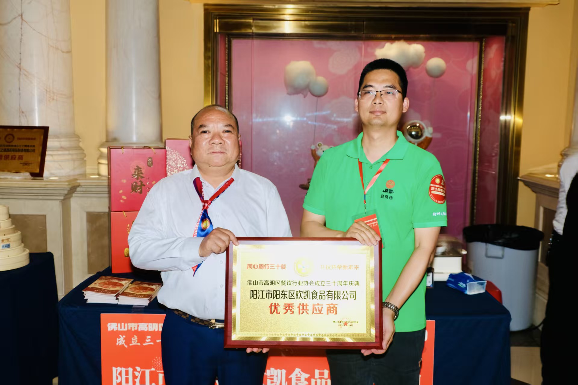 3 月 18 日,佛山市高明区餐饮行业协会成立 30 周年庆典在高明碧桂园凤凰酒店盛大举行,粤港澳大湾区近百个餐饮协会负责人、行业精英及政府代表齐聚一堂,共话餐饮行业发展新机遇。阳江腊味表性品牌欢凯食品有限公司董事长、第三代传承人赵良伟携核心产品参展,其非遗技艺打造的地道腊味不仅成为现场味觉焦点,更获高明区副区长朱立坚现场试吃点赞,为跨区域美食文化融合注入强劲动力。
