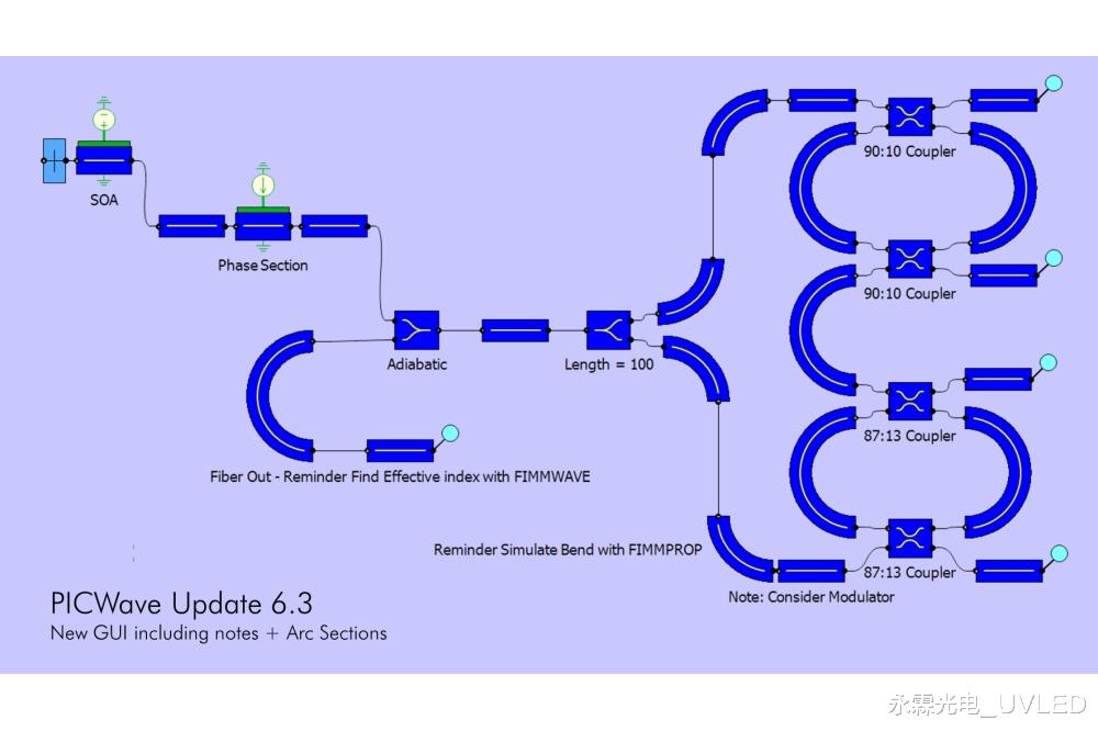 PICWave集成了Photon Design的有源元件模拟器(如HAROLD)与无源元件模拟器(如FIMMPROP),旨在提供强大的PIC设计方案。这种集成对于工程师的设计流程而言至关重要,它具备灵活的3D、随时间变化的仿真能力。所集成的有源元件涵盖半导体光放大器(SOA)、激光二极管、混合硅激光器、分布反馈激光器(DFB)、可调谐激光器以及环形激光器等。此外,诸如光栅模型、常见的PIC组件(如定向耦合器)以及优化的无损弯曲等均可导入。
