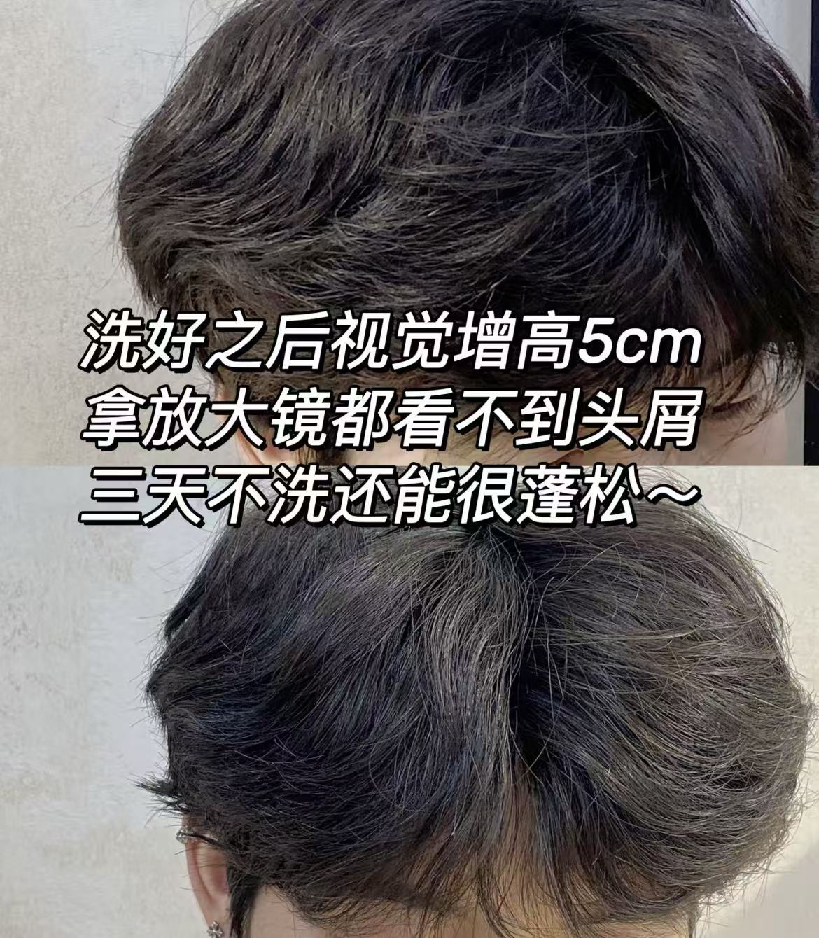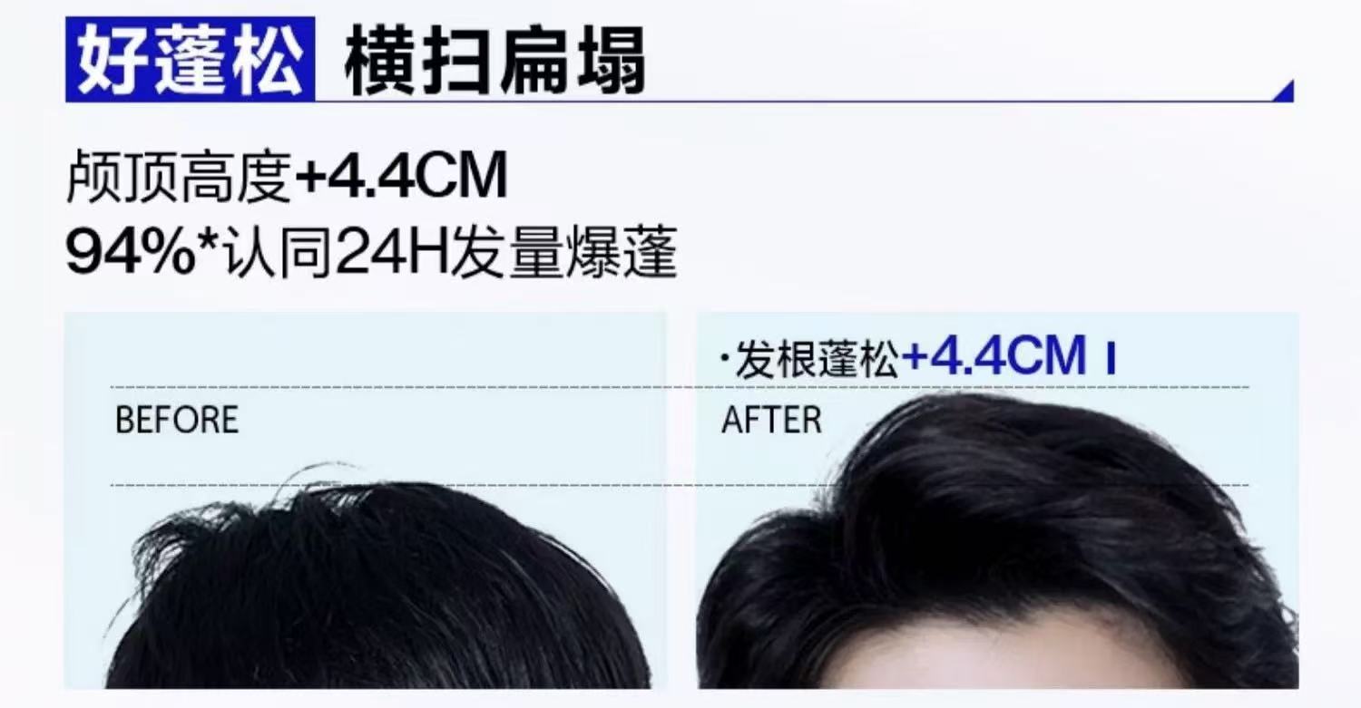 蓬松感:颅顶高度+4.4CM,94%认同24H发量爆蓬,头发从扁塌贴头皮变得立体有型,视觉发量翻倍。