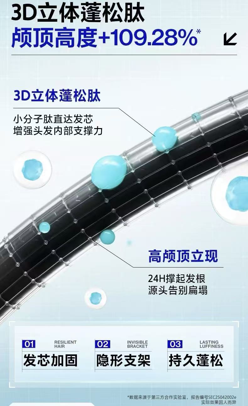 3D立体蓬松肽:小分子肽直达发芯,增强头发内部支撑力,实测颅顶高度+109.28%,从根源解决头发扁塌问题,让“高颅顶”不再是奢望。