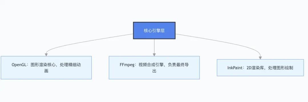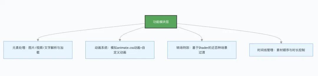 Node.js整个项目的运行环境,让前端工程师可以用熟悉的 JS 语法开发;FFmpeg视频处理的底层依赖,负责视频拼接、格式转换等核心操作;OpenGL图形渲染引擎,处理动画效果的实时渲染;InkPaint基于 OpenGL 的 2D 渲染库,负责文字、图片等元素的绘制;fluent-ffmpegNode.js 下的 FFmpeg 封装库,简化视频处理的 API 调用;tween.js动画缓动库,实现平滑的动画过渡效果;gl-transitions基于 Shader 的转场效果库,提供近百种转场动画。这些技术的组合非常巧妙 —— 用前端熟悉的工具链,解决了视频合成这个传统上需要复杂后端或专业软件的问题。