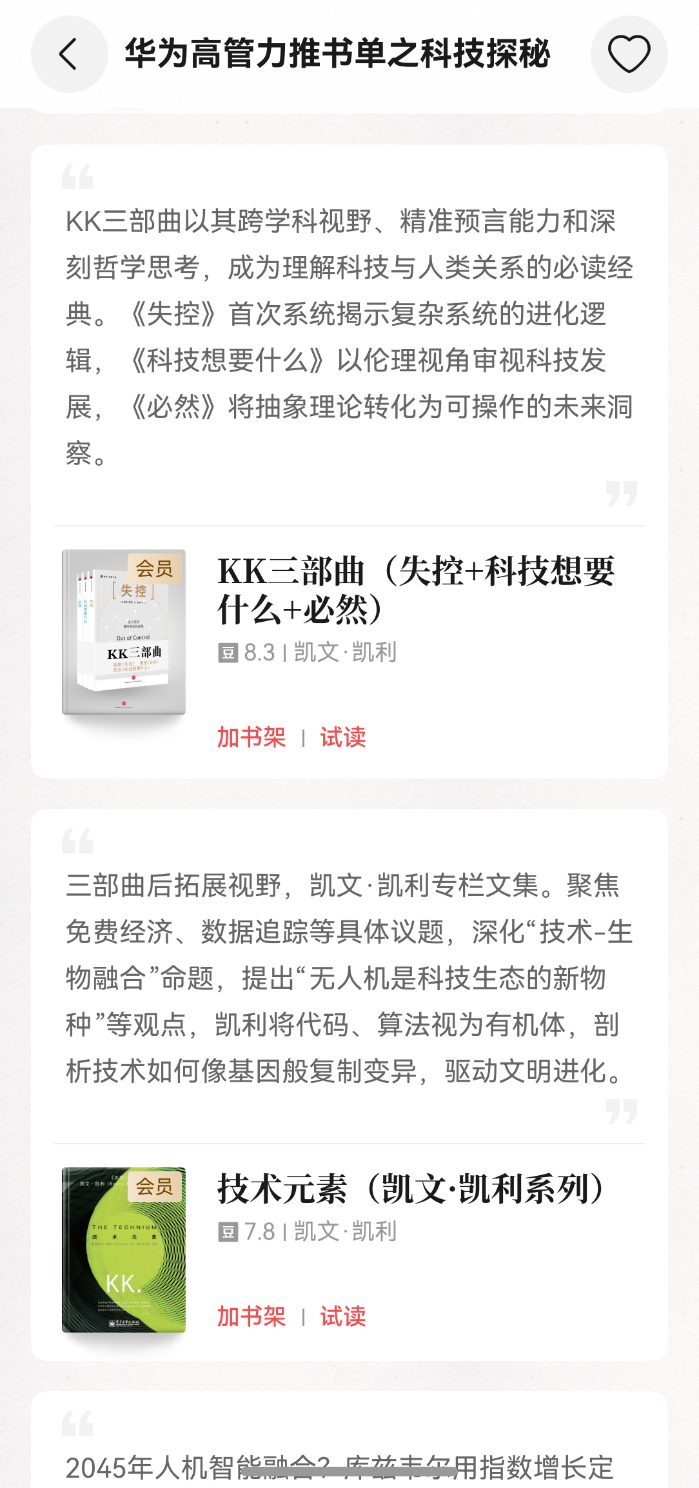 正巧,我在常用的华为阅读上,发现他们新推了一个“华为高管力推书单”系列。这是华为高管、管理顾问和华为大学,推荐员工阅读和观看的书单。对于选择困难群体选择书单来说,很有借鉴意义。而且,书单的主题切分得特别好,比如“科技探秘”主题就戳中了我。我们这些靠互联网吃饭的,不就是在科技浪潮里冲浪吗?