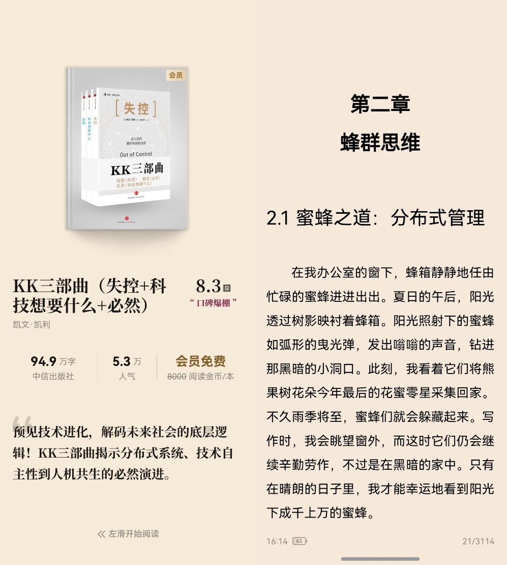 最先啃的是《失控》。KK在二十多年前就预言了蜂群思维、分布式网络。我现在的生活不就是这样吗?没有固定的办公室,全球的自由职业者通过网络协作,形成一个巨大的、去中心化的系统。读懂了这个,我才算真正理解了自己所处的生态位。