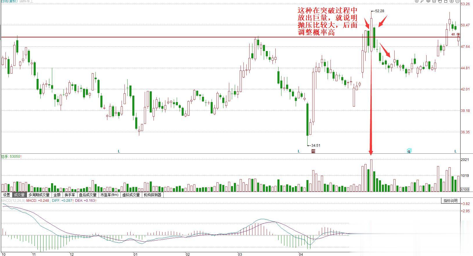 什么是巨量呢?就是明显比前面放大量的位置的量还大很多,而只要是放出巨量,就说明这种位置一定是有巨大分歧,一定是有巨大抛压存在,才会放出巨量。