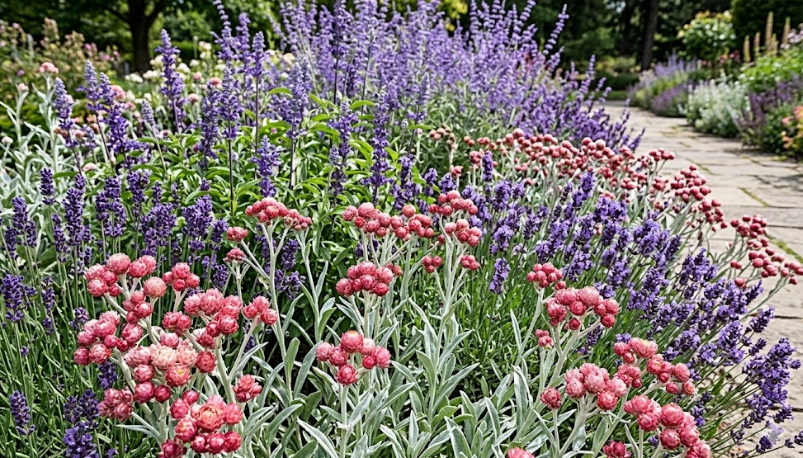 银叶蜡菊最大的用处,就是给花境当“配角”里的主角。它的银灰色叶片,跟任何颜色的花都能搭。