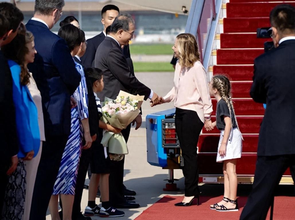 梅洛尼女儿久违出镜,穿着粉色羽绒服下身配灰色裤装,一身浅色穿搭脚踩小白鞋元气满满!这就是意大利女总理的女儿吉内芙拉,年龄不大却很自信,跟着妈妈一起下飞机并与接机人员握手,好似个小大人。