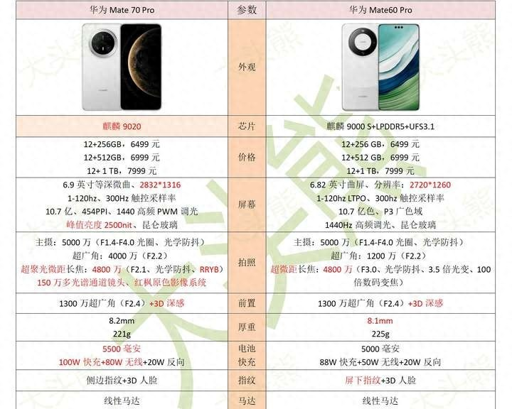 看看详细参数配置对比:华为Mate70Pro的主要升级这几个方面: