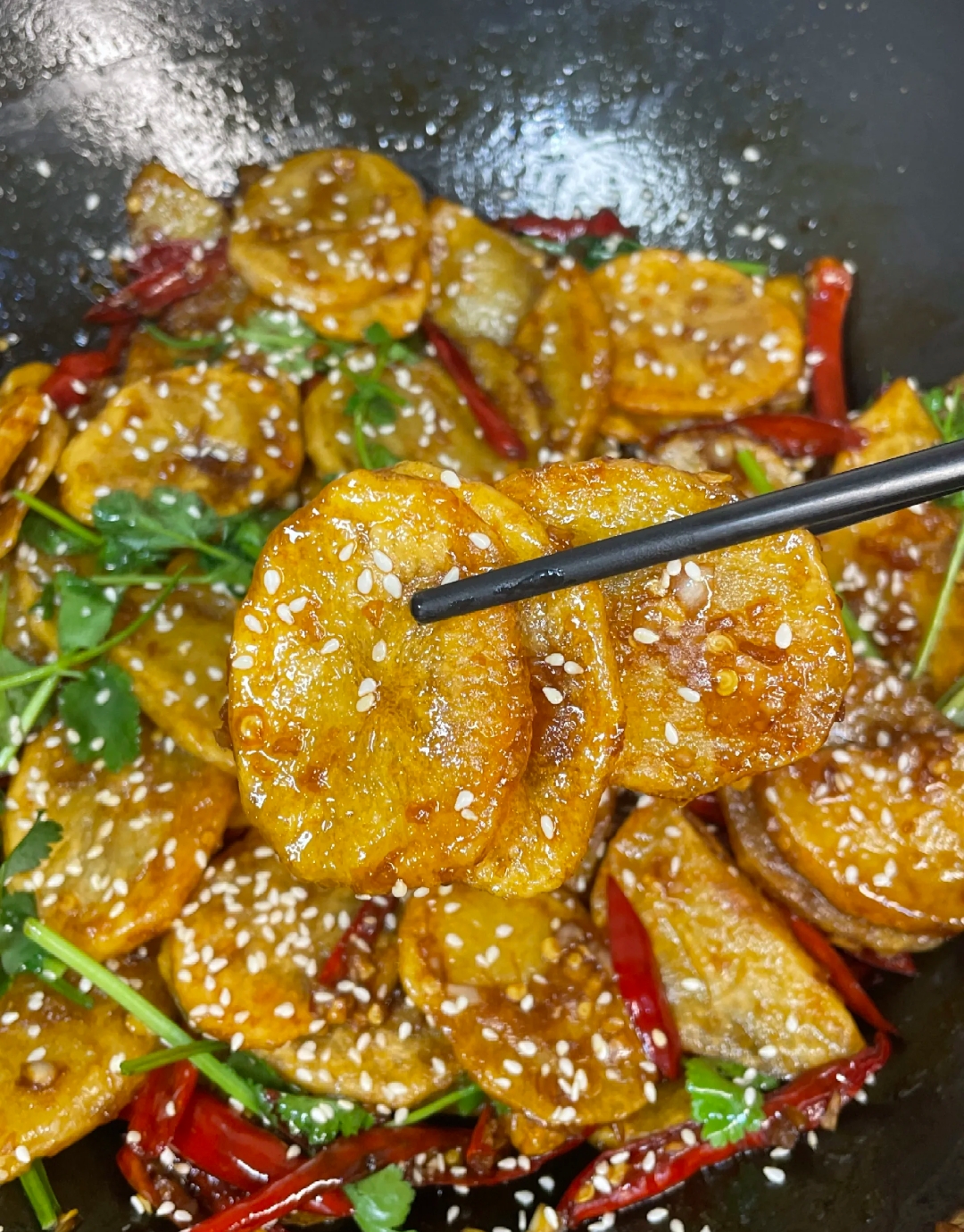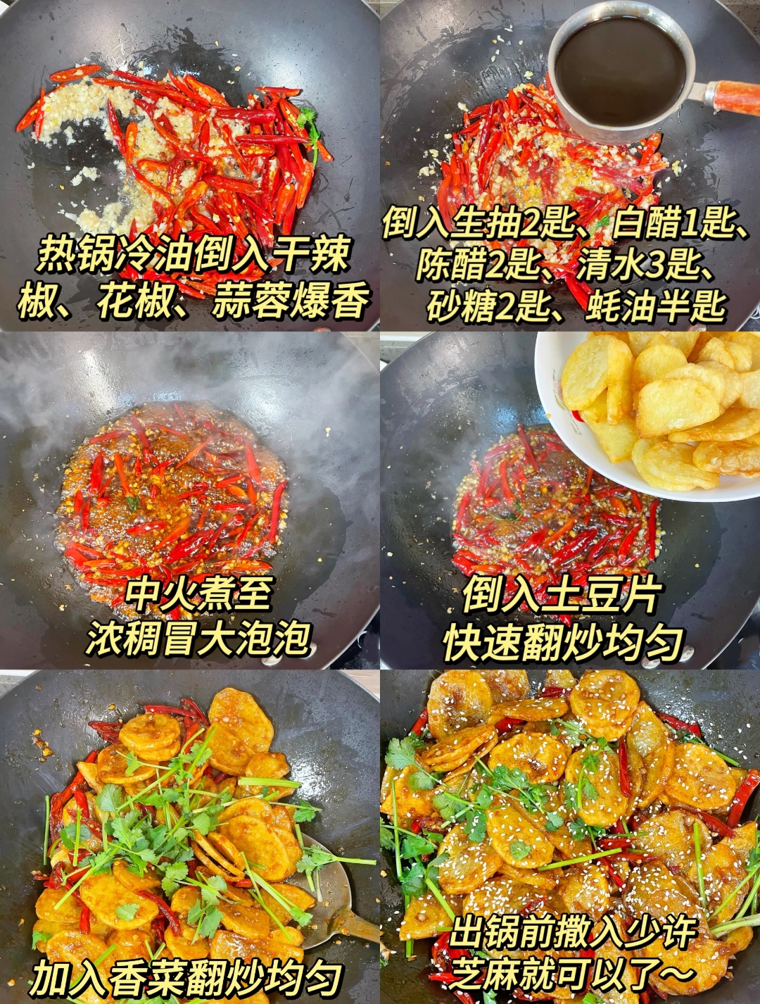 最后一步便是见证美味的融合。将炸好的土豆片迅速倒入浓稠的酱汁中,动作要快,快速翻炒均匀,让每一片酥脆的土豆都裹满酸甜的酱汁。出锅前撒上一把翠绿的香菜增色提味,再撒入少许熟芝麻点缀,一道色香味俱全的风味土豆片便可装盘上桌了。