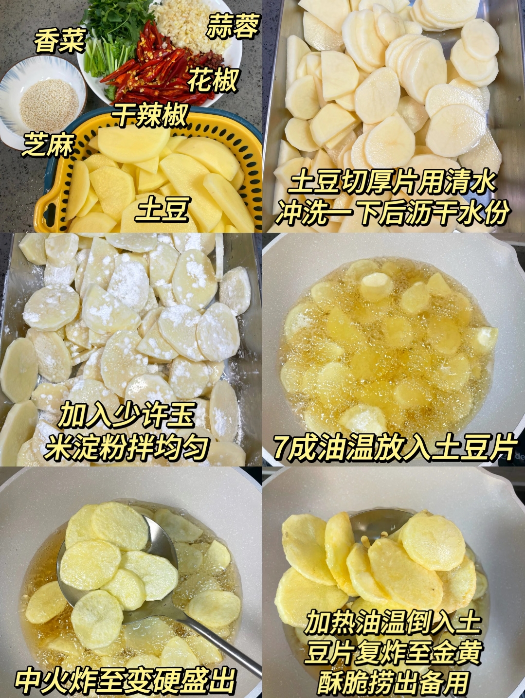首先,食材的选择与初加工是口感的基石。挑选几个新鲜的土豆,洗净去皮后,关键在于刀工,要将其切成厚度适中的厚片,太薄容易炸干,太厚则不易熟透。切好的土豆片不能直接烹饪,必须放入清水中冲洗,这一步能有效洗去表面多余的淀粉,防止炸制时粘连且保证口感清爽。洗净后沥干水分,撒入少许玉米淀粉抓拌均匀,让每一片土豆都裹上薄薄的一层“外衣”,这是炸出酥脆外壳的小秘诀。