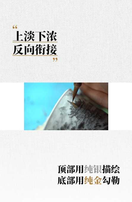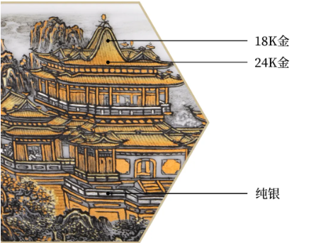 艺林堂工艺师以上淡下浓的反向衔接法, 让金自上而下减薄,银由下而上渐淡, 两种金属在中部自然交融, 如山间云雾与阳光的相遇。