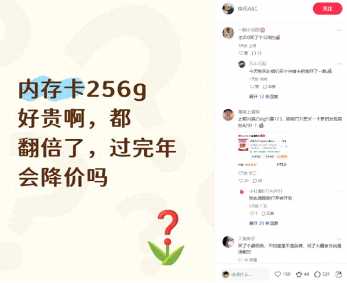 此外,“内存卡暴涨”“内存卡涨价”等关键词频繁出现在社交媒体热搜,与之相关的“购买建议”“涨价原因”也成为热门搜索内容。