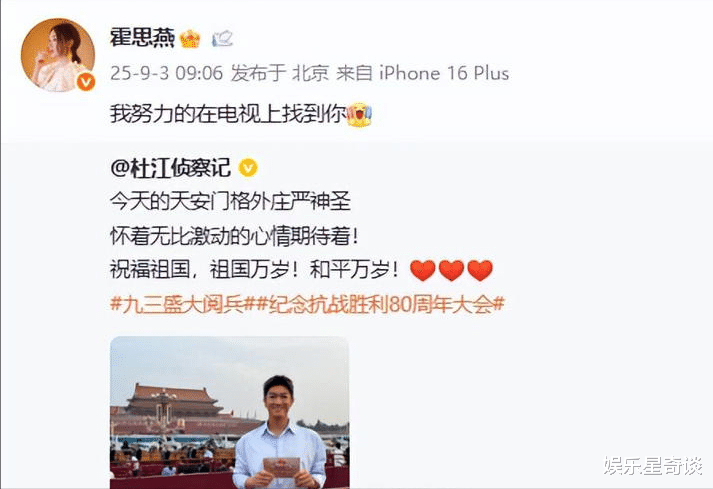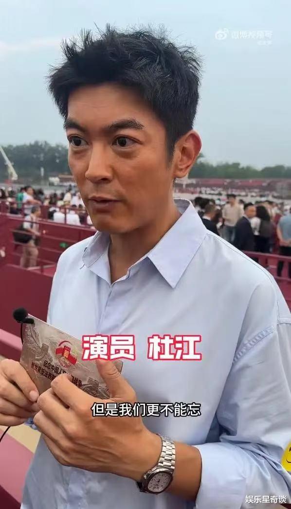 杜江在个人微博“杜江侦察记”中写道:“今天的天安门格外庄严神圣!怀着无比激动的心情期待着!”在接受采访时,他郑重地表示:“正是英雄先辈的抛头颅洒热血,才有今天的幸福生活。”他的每一句话都充满了对国家的热爱与责任感,而当大国重器从眼前缓缓驶过时,他的目光中闪烁着敬意与骄傲。他说,这不仅仅是一场庆典,更是一次对未来的期许,也让他感受到作为演员的使命——不仅要在作品中展现力量,也要在现实中传递正能量。