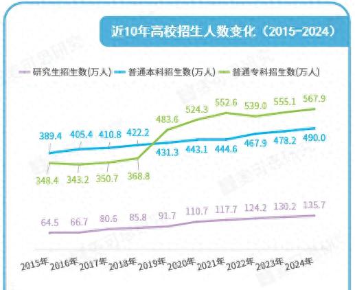 根据国家统计局数据,普通专科招生人数从2015年的348.4万人,跃升至2024年的567.9万人。10年间招生规模增长将近220万。
