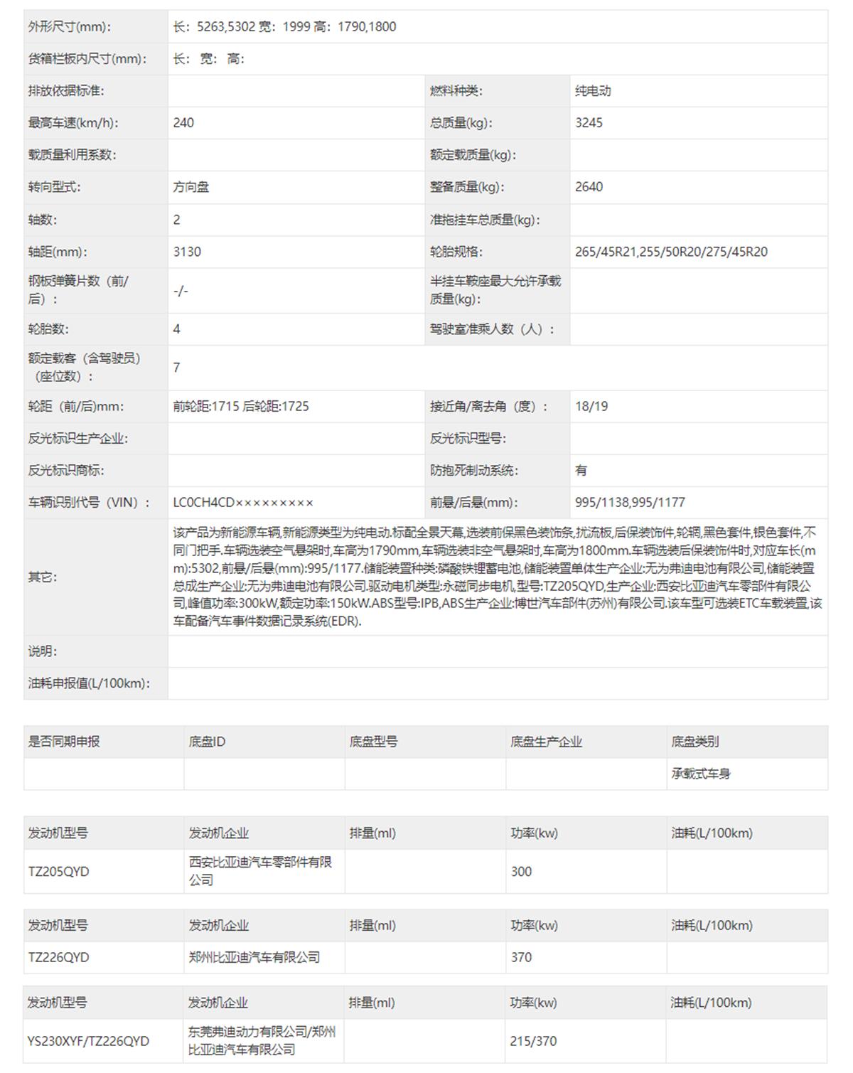 动力方面,此次申报的比亚迪大唐都是搭载了纯电动力,共有三种版本,其中单电机版本的最大功率会有300千瓦和370千瓦两种,双电机版本前后电机最大功率分别为215千瓦和370千瓦。