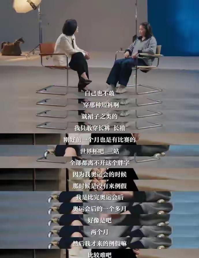 更可怕的是心理上的阴影。她开始害怕体重秤,“看到体重秤我就特别害怕”。不敢照镜子,“老觉得自己特别胖、特别壮”。也不敢面对镜头,“别人拍我我也很害怕”。那几个月,她全靠肌肉记忆在跳,晚上做梦都是自己从跳台上掉下来。