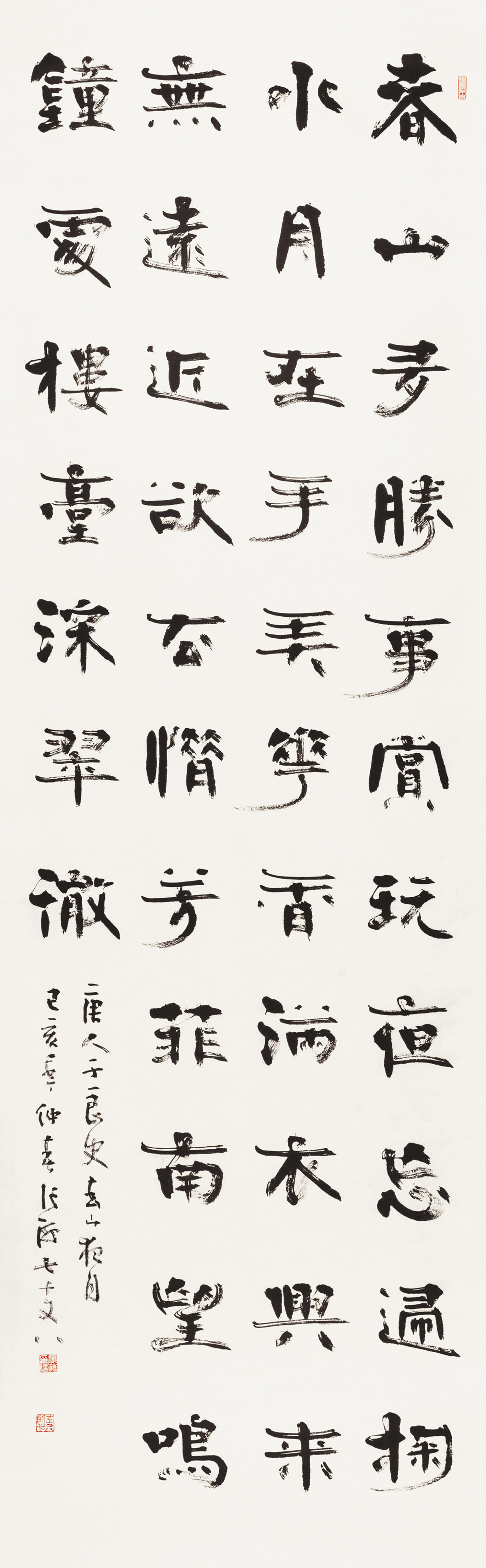 “三庆探索一直在路上”,是艺术追求的永恒姿态。 “在路上”是一个充满动感和希望的状态,意味着艺术生涯没有终点,探索永无止境。张海先生将此作为一庆,表明了他对书法艺术无限深广的认知,以及永不满足、永不停步的进取精神。艺术的高峰遥接云端,真正的艺术家永远是仰望者、跋涉者。这种“在路上”的心态,驱使张海先生不断汲取传统精华,又大胆融汇时代气息,在古典与现代、法度与性情之间寻找个性化的表达。“在路上”让艺术生命摆脱了年龄、时誉的束缚,始终保持着向前、向上的张力。这不仅是张海先生个人艺术长青的秘诀,也是对后学的殷切寄语:艺术之路,唯有持之以恒,孜孜不倦,方能在漫长的跋涉中,领略到常人难以见到的风景。