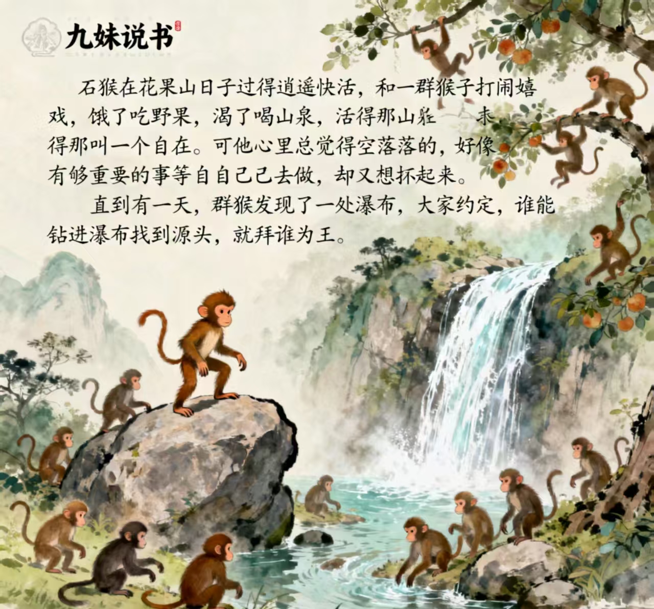 石猴在花果山过得逍遥快活,和一群猴子攀树摘果、打闹嬉戏,饿了啃鲜桃,渴了饮山泉,活得那叫一个恣意。可他心里总空落落的,像丢了啥要紧东西,总觉得有件大事等着自己,却怎么也想不起来。直到那天,群猴在山涧发现一处瀑布,水流湍急如雷,大家起哄约定:“谁能钻进瀑布找到源头,咱就拜谁为王!”