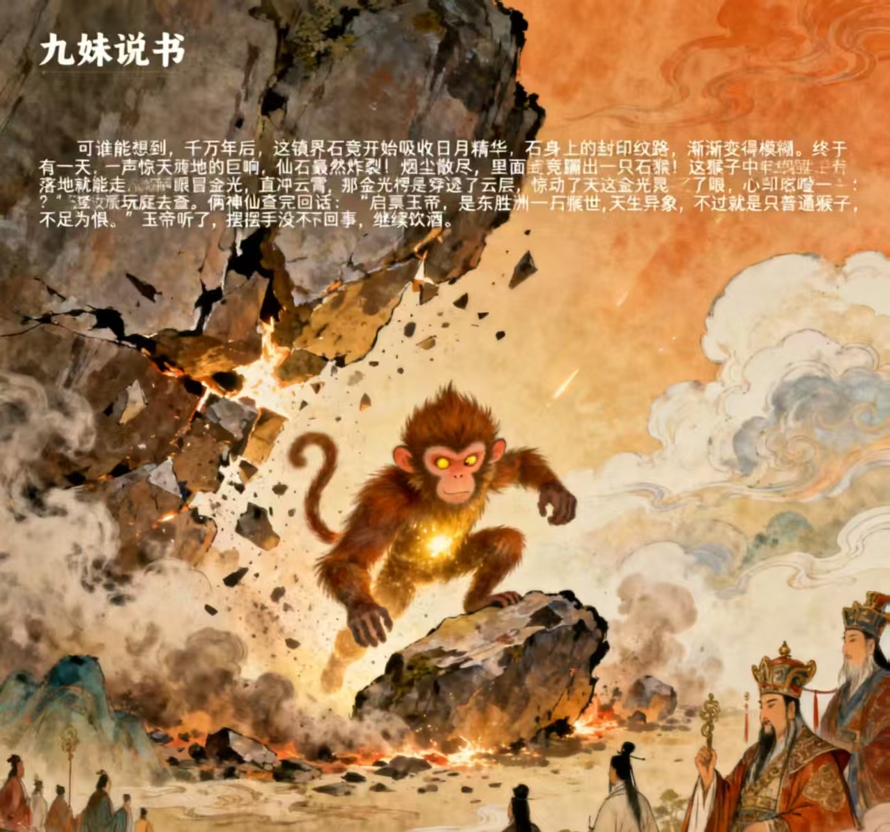 可他们哪儿知道,这石猴的出世,根本不是偶然!我九妹琢磨这故事的时候,越想越心惊——那镇界石之所以裂开,是三界的邪气在暗中啃噬,封印早已松动!而这石猴,是天道派来的“封印守护者”!只是他刚出生,使命还沉睡着,纯属一只不知天高地厚的懵懂野猴。