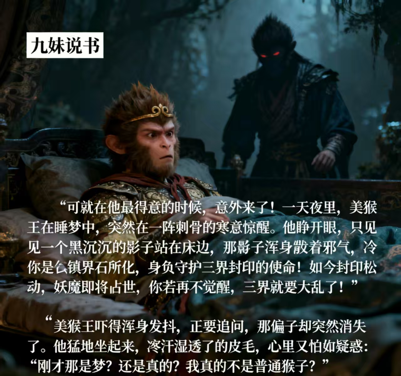 可就在他最得意忘形的时候,反转来了!一天夜里,美猴王在石床上睡得正香,突然被一阵刺骨的寒意惊醒。他猛地睁开眼,只见一个黑沉沉的影子立在床边,那影子像团化不开的墨,浑身散发着让人头皮发麻的邪气,冷笑着说:“石猴,你以为你只是只猴子?你是镇界石所化,身负守护三界封印的使命!如今封印松动,妖魔即将现世,你若再不觉醒,三界就要大乱了!”