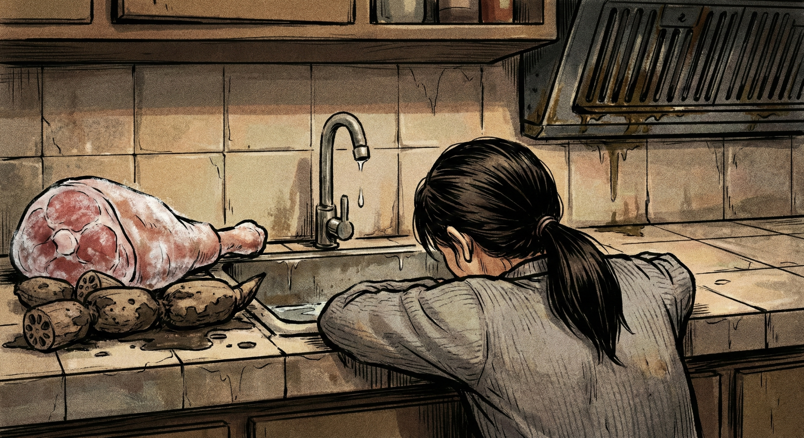 满手都是生肉那股子化 不开的腥膻味,让我自己都嫌 弃我自己。我盯着厨房台面上那个比石头还硬 的冻猪腿,旁边是一兜子还在往下掉黑泥的莲藕。
