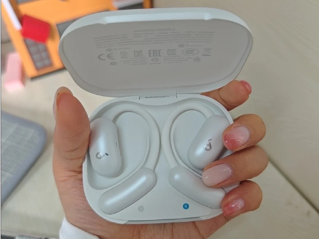 在佩戴上,耳机用的高弹柔软液态硅胶,摸着手感好,戴久了也舒服;耳挂有四档可调,能适应不同耳型,调好了戴得特别稳;防水是IPX4 级,出汗或者下小雨都不用怕;单只耳机才10 克,戴着没啥负担,运动时也能戴的很稳。