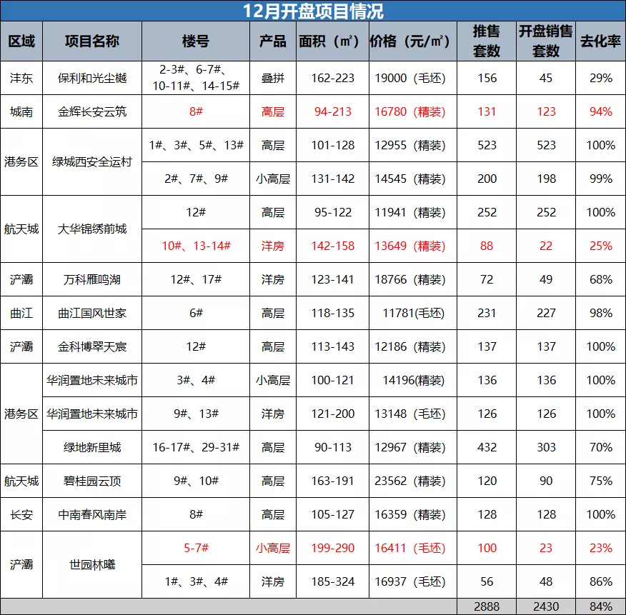 截止目前,12月共计开盘项目为12个,从楼盘表现来看,刚需盘基本未受新政影响,红盘依旧火热。绿城西安全运村、大华锦绣前城(高层)、华润置地未来城市三盘作为千人摇热门选手依然保持其高水准,开盘即罄,而改善房源去化不容乐观。大华锦绣前城洋房产品上个月1.45万/㎡均价开盘售罄,而此次1.36万/㎡的均价去化仅25%。世园林曦新盘入市,小高层产品去化实在惨淡,最低入手门槛131万起令项目去化“受伤严重”。也有异军突起,乘新政东风,借势翻盘的项目。金辉长安云筑新政前去化平淡,目前城南整体供应房源不多,本次主要推售94-118㎡户型,新政出台后,这批小户型着实抢手。