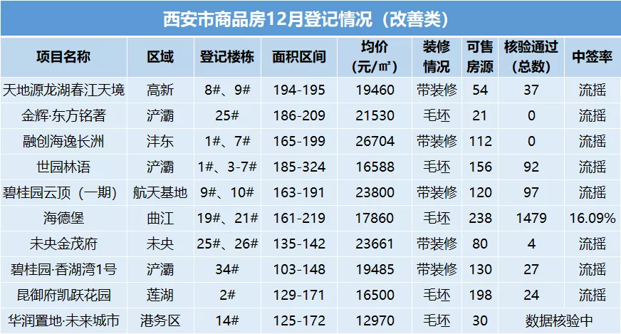 注:数据包括沣东新城,统计截止12月21日,其中2盘核验中甚至部分1万出头的低价刚需盘也在流摇盘之列,受到首付增加影响,购房者置业意向推迟,回归更加理性的状态。2、购房者置业热情降低。供应量严重不足加上月初政策收紧,使很多置业者购房热情受到冲击。11月核验通过人数与房源数量比例呈现4:1,而到了12月人房登记比例仅为1.5:1。3、大面积改善遇冷。截止12月21日,本月共登记16个楼盘,其中10个改善盘(参考两个维度:超144㎡大面积及单价超1.9万/㎡)8个流摇,1盘核验中 。