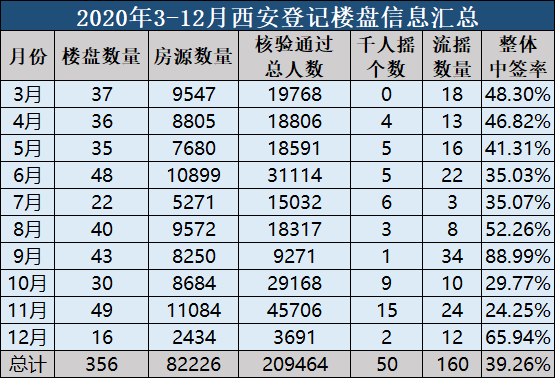 注:数据包括沣东新城,统计截止12月21日,其中2盘核验中1、流摇盘占比扩大,千人摇锐减,整体中签率上升。10月后市场整体中签率都不足三成,而12月中签率高达66%。