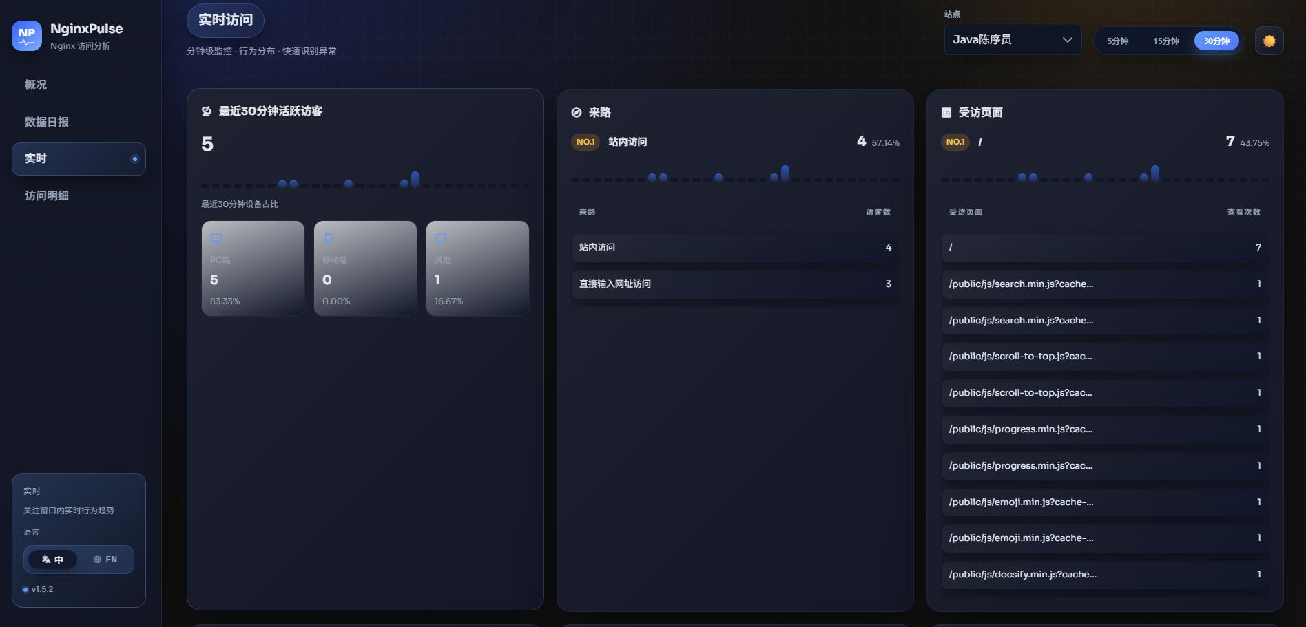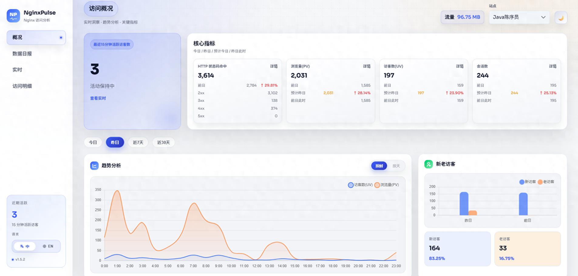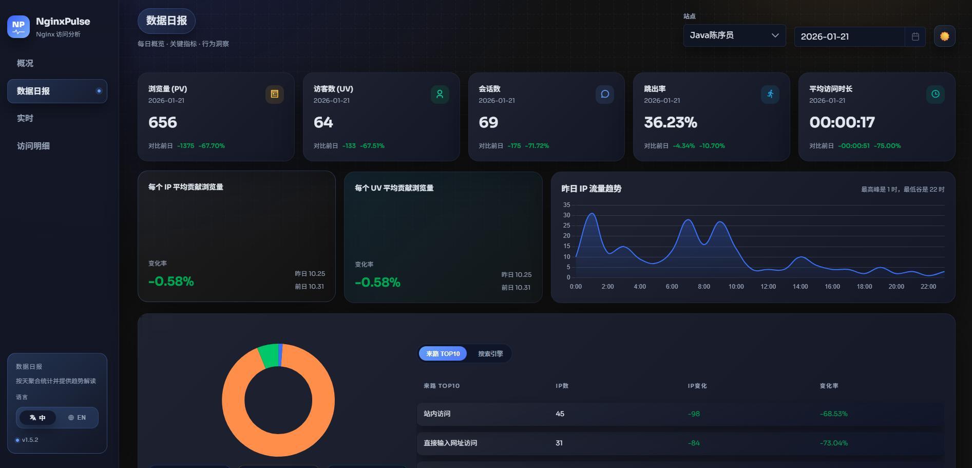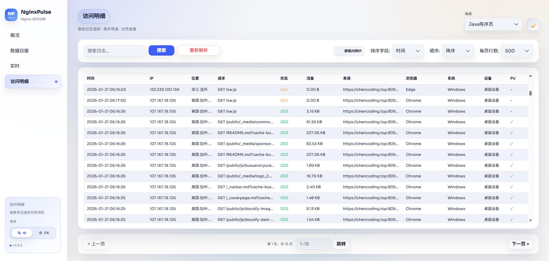 项目介绍nginxpulse —— 一款轻量级 Nginx 访问日志分析与可视化面板,提供实时统计、PV 过滤、IP 归属地与客户端解析。