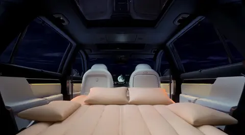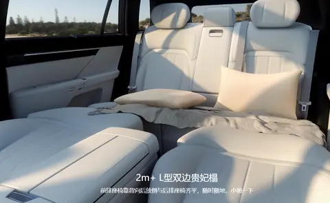 看到这里,你应该已经猜到eπ008的特色就在于这是一款奶爸车,那么彩电有了,冰箱和沙发怎么能少呢?该车搭载6.5L的冷暖两用智能冰箱,5/50℃ 双温控可保鲜可保暖,并支持语音控制、远程控制及下电保温功能,露营时提前给宝宝温8瓶奶也没问题。此外,eπ008配有沙发般柔软的二排电动魔毯座椅,4、6分腿托可单独调节,同时还可将该车的主副驾拆掉头枕后与二排坐垫齐平,构成“小L型”布局;配合后排左侧腿托升起,可形成2m多长的“大L型”双边贵妃榻,可卧、可盘、可躺,主打一个随心。