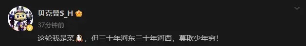 在赛后,贝克曼也是发文称:这轮我是菜!但是三十年河东三十年河西!莫欺少年穷!