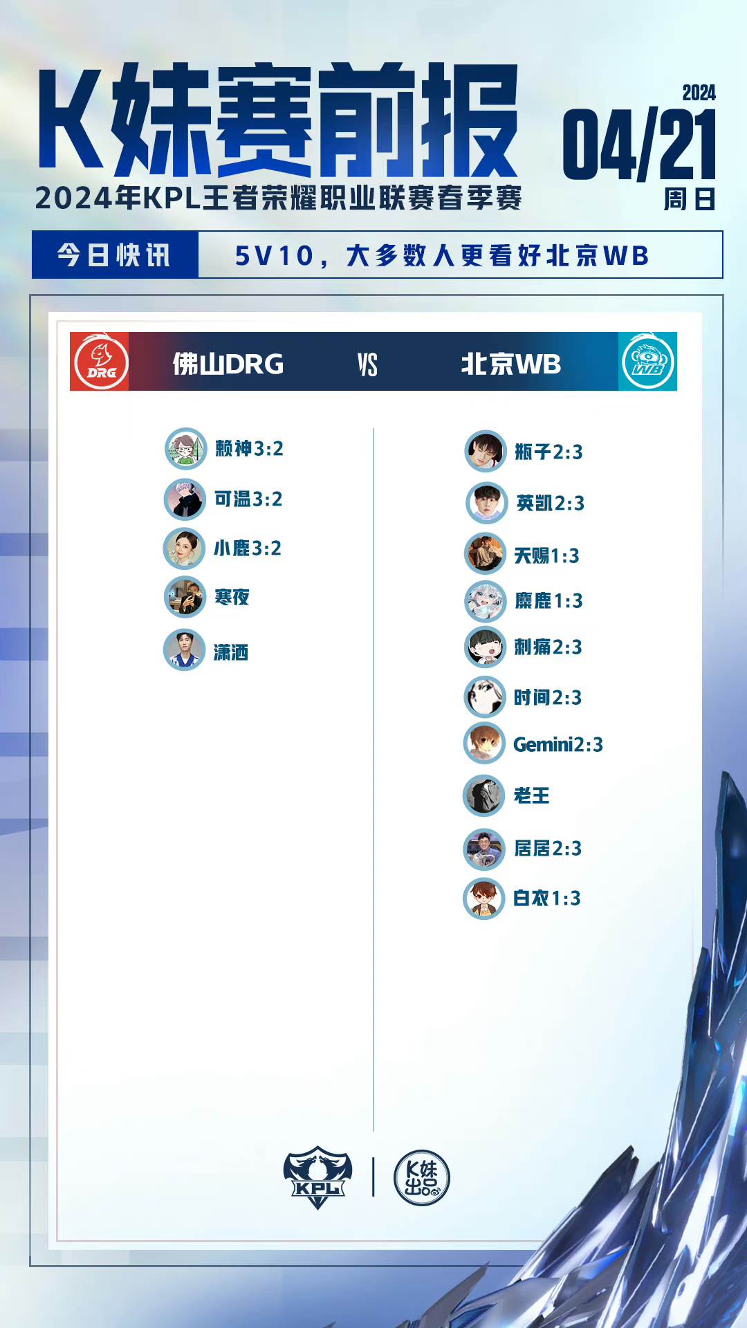 要知道,即便是WB之前的比赛连续输给AG和狼队,在本场比赛开赛之前,绝大多数的预测嘉宾还是看好WB的,并且看好DRG的嘉宾无一人认为DRG可以零封WB。